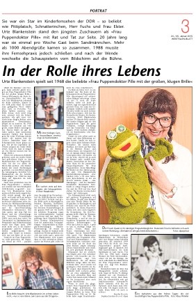 Die Rolle der Frau Puppendoktor Pille ist ihr auf den Leib geschrieben und hat sie die meiste Zeit ihrer Karriere begleitet – als Kulturschaffende der DDR und als freiberufliche Unterhaltungskünstlerin vor und nach der Wende. Doch das Leben der Urte Blankenstein kennt noch viele weitere Stationen.